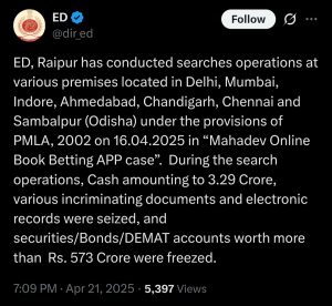 कार्रवाई को लेकर ईडी की एक्स पोस्ट