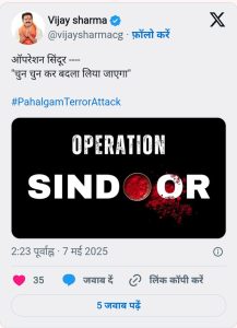 वहीं प्रदेश के उप मुख्यमंत्री और गृहमंत्री विजय शर्मा का भी प्रतिक्रया सामने आई है। उन्होंने भी सोशल मीडिया एक्स पर वीडियो जारी करते हुए लिखा कि ऑपरेशन सिंदूर “चुन चुन कर बदला लिया जाएगा”