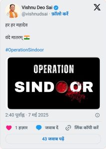 ऑपरेशन सिंदूर : CM विष्णुदेव साय ने एक्स पर लिखा- हर हर महादेव, उपमुख्यमंत्री शर्मा बोले- चुन चुन कर बदला लिया जाएगा, दीपक बैज ने कहा- आतंक के खिलाफ मुंह तोड़ जवाब