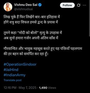 ऑपरेशन सिन्दूर के सफल होने पर मुख्यमंत्री विष्णुदेव साय ने लिखा कि ‘लिख चुके हैं फिर लिखेंगे बार-बार इतिहास में