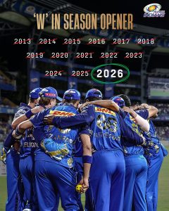 मुंबई इंडियंस ने आईपीएल 2026 के अपने पहले मुकाबले में केकेआर को हराकर शानदार शुरुआत की. 13 साल बाद मुंबई की टीम ने जीत के साथ आईपीएल का आगाज किया है. . इस मैच में रोहित शर्मा और रेयान रिकेल्टन ने दमदार बल्लेबाजी की. इंडियन प्रीमियर लीग (आईपीएल 2026) में रविवार को कोलकाता नाइट राइडर्स और मुंबई इंडियंस के बीच मुकाबला खेला गया. इस मैच में मुंबई इंडियंस ने 6 विकेट से शानदार जीत हासिल की. साल 2012 के बाद ये पहला मौका था जब आईपीएल के अपने पहले मैच में मुंबई इंडियंस ने जीत हासिल की है. आइए आपको बताते हैं कि मुंबई के इस जीत के 5 कारण क्या रहे..