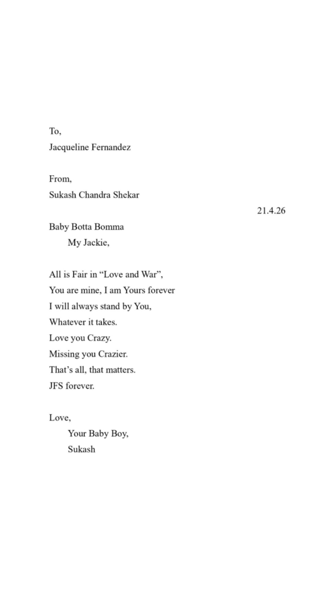 21 अप्रैल को लिखे इस लेटर में सुकेश ने जैकलीन को “बेबी बोम्मा” और “मेरी जैकी” कहकर संबोधित कर लिखा- “प्यार और जंग में सब जायज है” और हर परिस्थिति में वो हमेशा उनके साथ खड़े रहेगे।